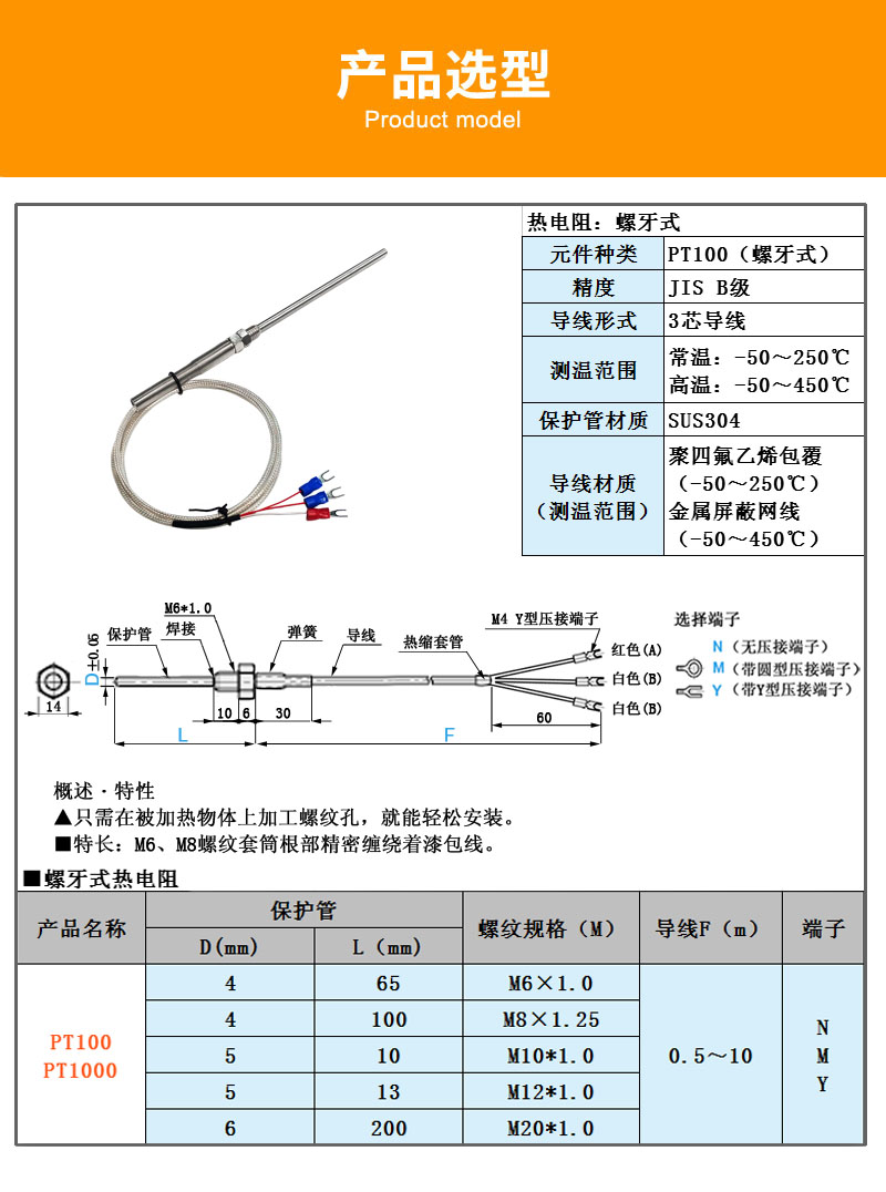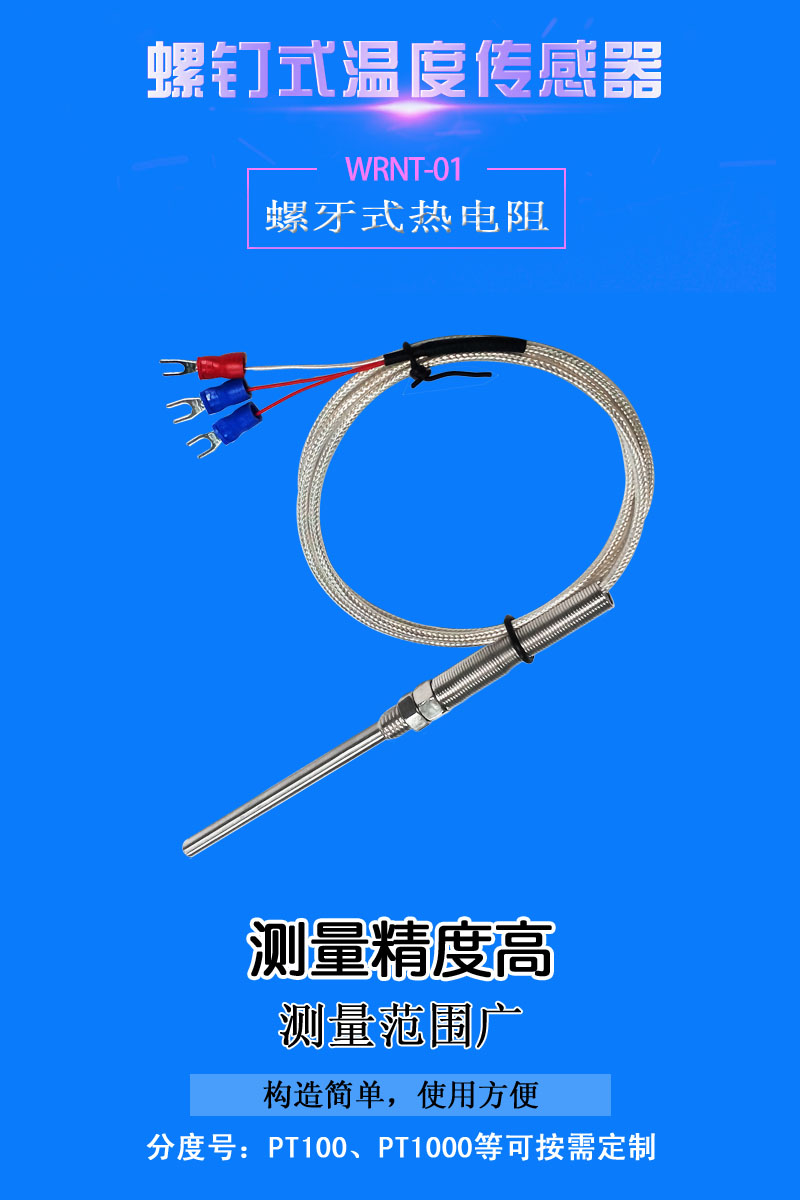 熱電阻外殼為不銹鋼304和316L,默認尺寸是直徑4mm*長度30mm(如要其他尺寸可咨詢客服),測溫范圍-50-200℃(另有特殊溫度范圍可選-200-200℃,或者是-50-500℃)引線是三線制雙包鐵氟龍鍍銀屏蔽線(防腐蝕耐油)。