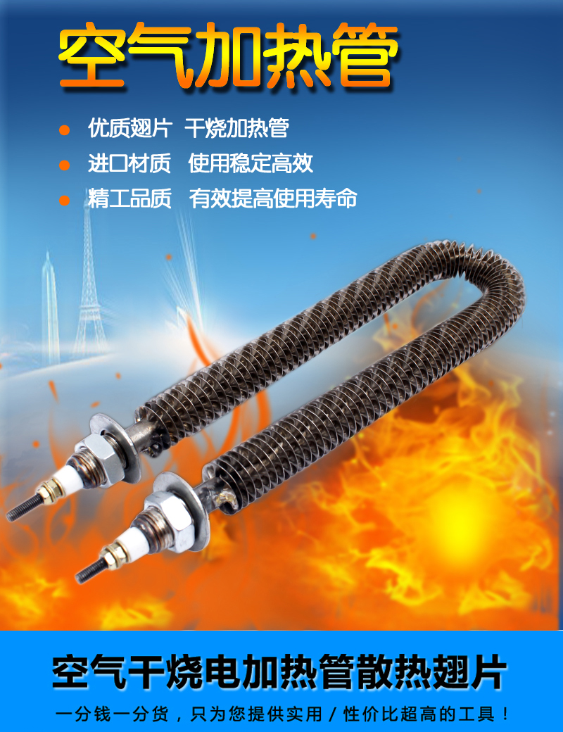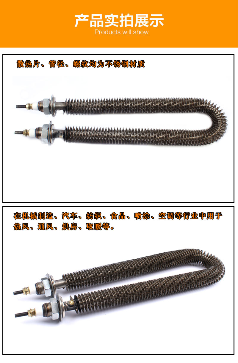 U型翅片加熱管采用優(yōu)質(zhì)不銹鋼、進(jìn)口氧化鏷粉、高電阻電熱合金絲、不銹鋼散熱片等材料,通過先進(jìn)的生產(chǎn)設(shè)備和工藝制作而成,翅片電加熱管可以安裝在吹風(fēng)管道中或其它靜止、流動空氣的加熱場合。它與普通加熱管相比,散熱面積擴大了2~3倍,即翅片元件所允許的表面功率負(fù)荷是普通元件的3~4倍。由于元件的長度縮短,使得本身的熱損失減小,在相同的功率條件下,具有升溫快、發(fā)熱均勻、散熱性能好、熱效率高、使用壽命長、加熱裝置體積小,成本低等優(yōu)點。根據(jù)用戶要求進(jìn)行了合理的設(shè)計,便于安裝。產(chǎn)品在機械制造、汽車、紡織、食品、家電等行業(yè),尤其在空調(diào)器風(fēng)幕行業(yè)得到廣泛應(yīng)用。